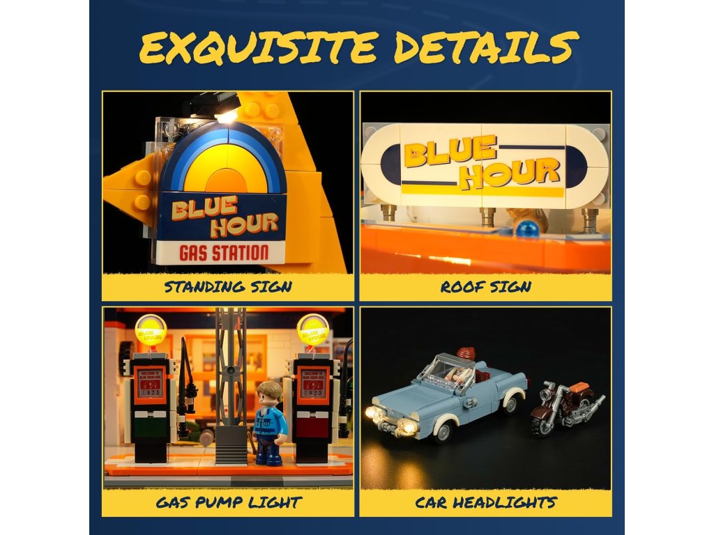 A készletben minden adott akár játékra, akár kiállítási darabként, retró kútoszlopok, kisbolt, autószerelő műhely – mozgatható emelővel és szerszámospolcokkal – , nagyméretű hirdetőtábla.