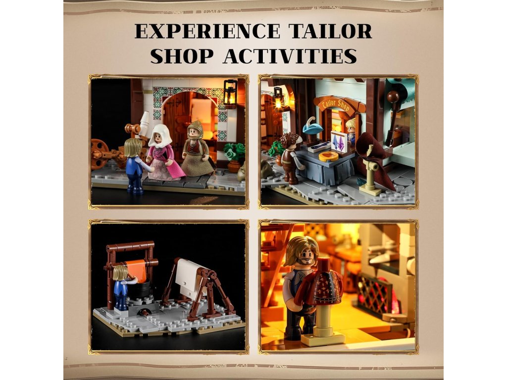 A készlet öt minifigurát tartalmaz egyedi karakterdizájnnal: egy tapasztalt szabót, a lányát, egy nemes hölgyet, egy szobalányt és egy szabófiút. A figurákkal és a rengeteg kiegészítővel (textilhengerek, olló, vasaló) minden adott a történetmeséléshez és kreatív játékhoz.