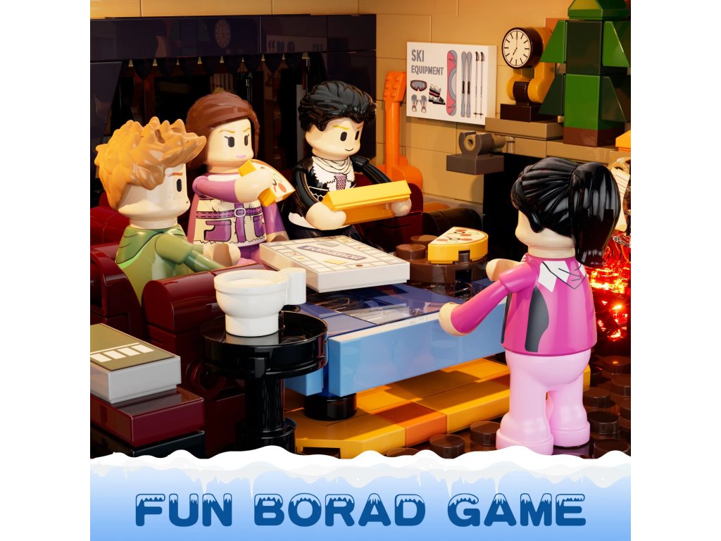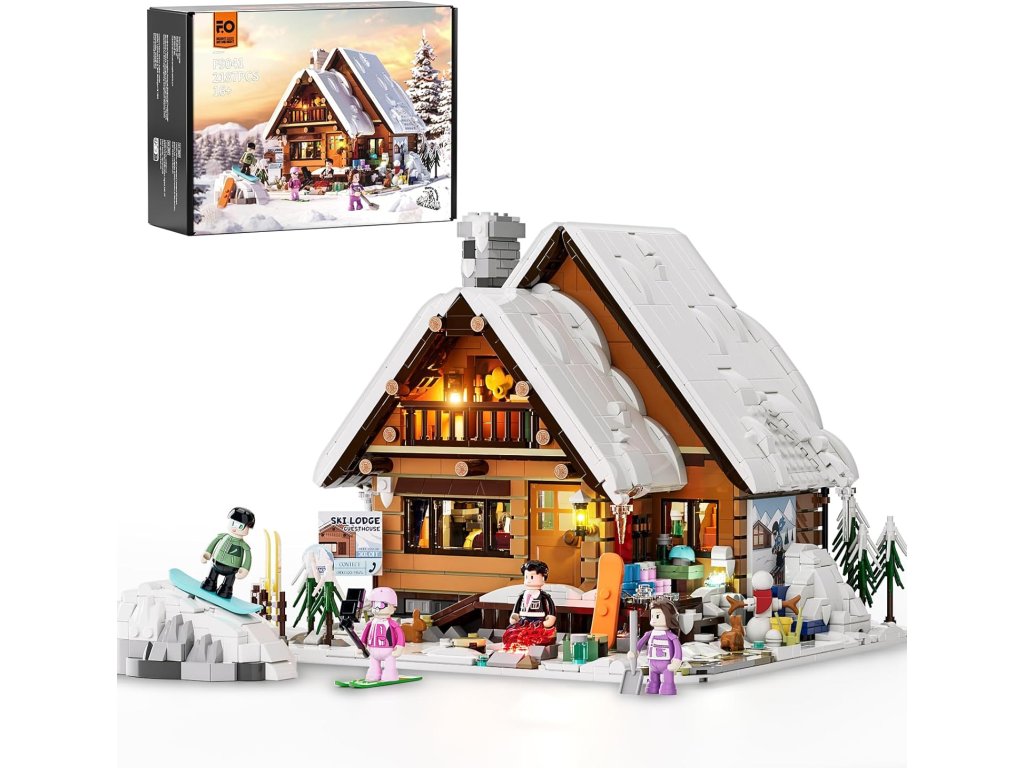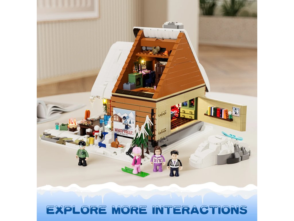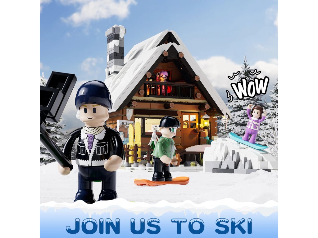 Téli kültéri jelenetek. Havas tető, hóember, sífelszerelések, és a forgó símodul élethű részleteket hoznak. A minifigurák sisakkal, sílécekkel, botokkal és még szelfibottal is felszereltek – az igazi téli hangulatért.