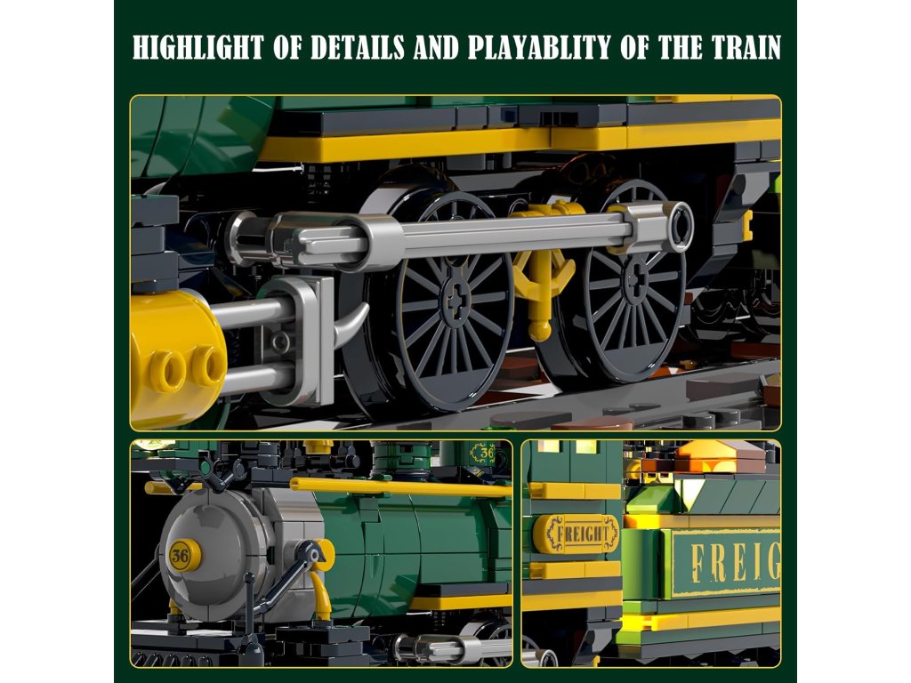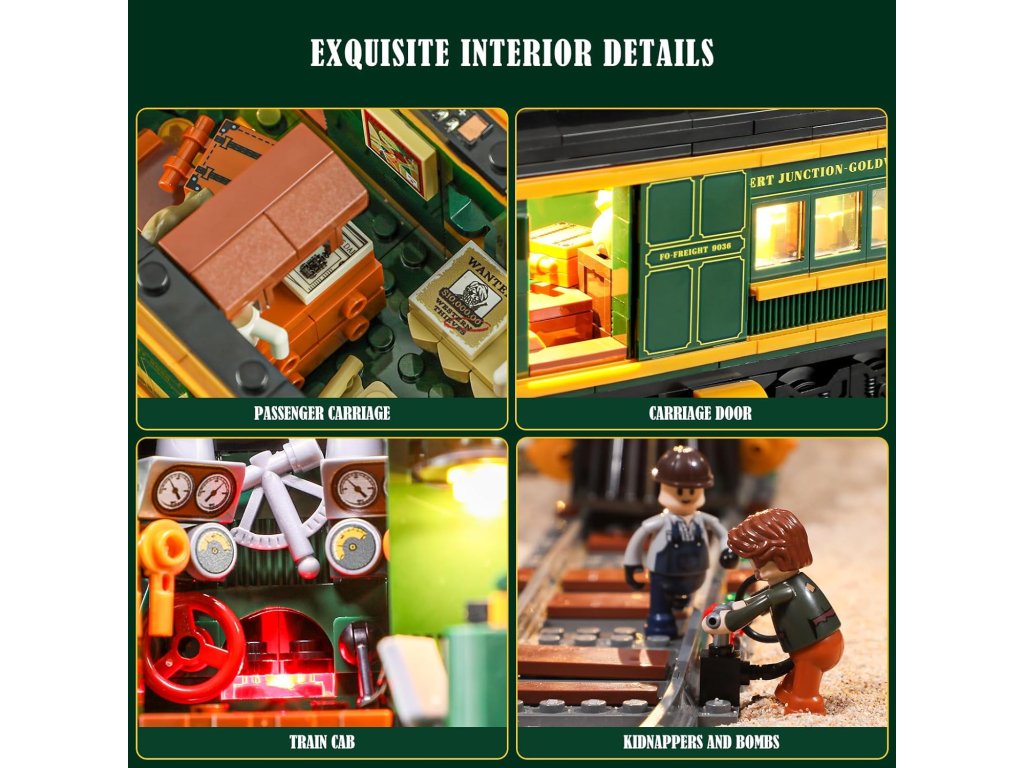 Részletesen kidolgozott gőzmozdony, forgóvázas szén- és rönkszállító vagon, érték- és személyszállító kocsi. További részletek, mint például aranyrudak, körözési felhívás, csákány és dinamit biztosítják a játék és a történetmesélés élményét.