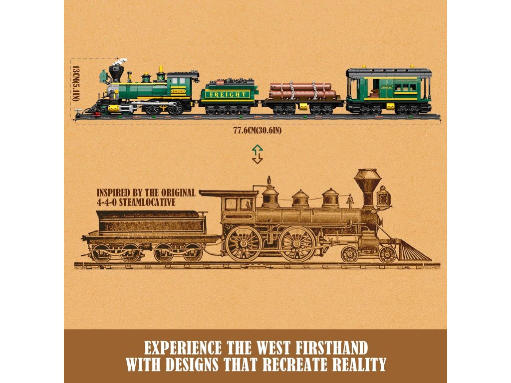 Az 1800-as évek végi híres 4-4-0-es gőzmozdonyok ihlette készlet, sínekkel és víztoronnyal, klasszikus western hangulat, gyűjtőknek és vasútrajongóknak.