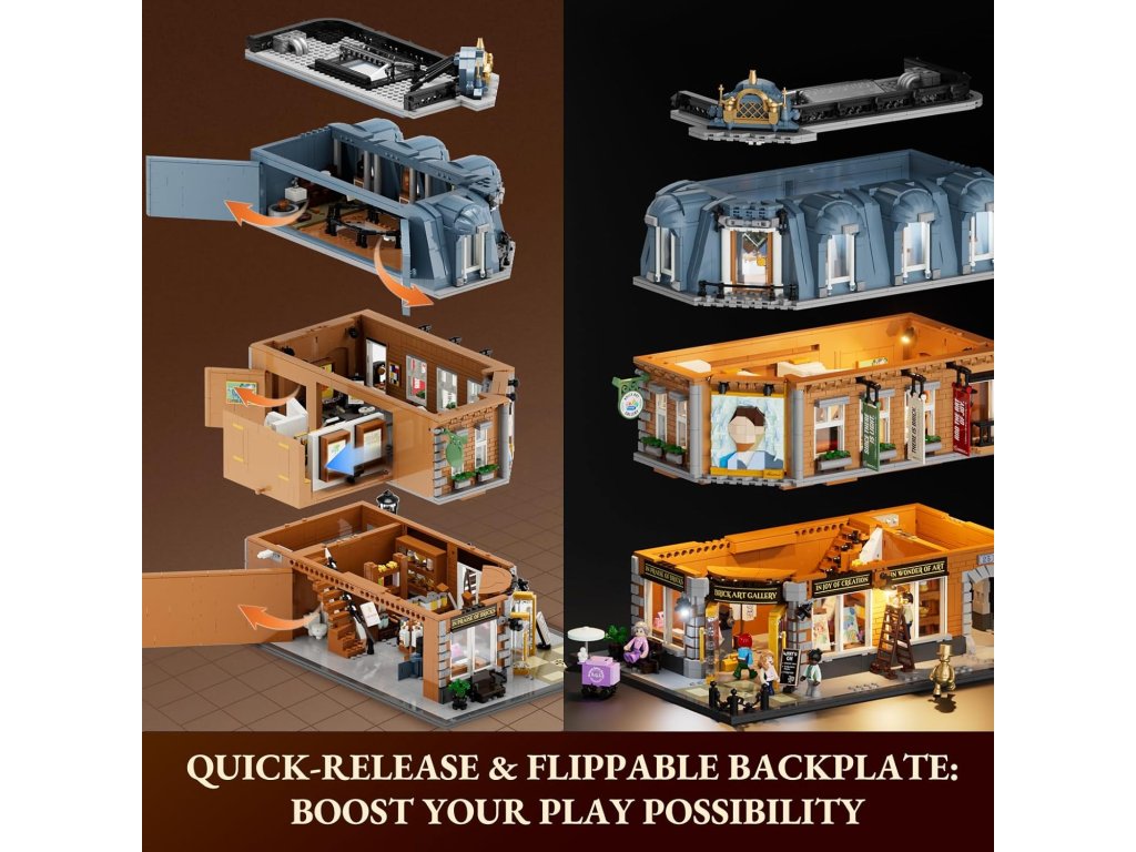 Aprólékos tervezés, az ötcsillagos építési és játékélményért. A leemelhető szintek, a modulárisan csatlakoztatható elemek és a teljesen nyitható hátsó fal rengeteg interaktív, felfedezési lehetőséget kínál. Legyen szó építésről vagy díszként a polcodon – ez a készlet minden szinten minőségi játékélményt nyújt.