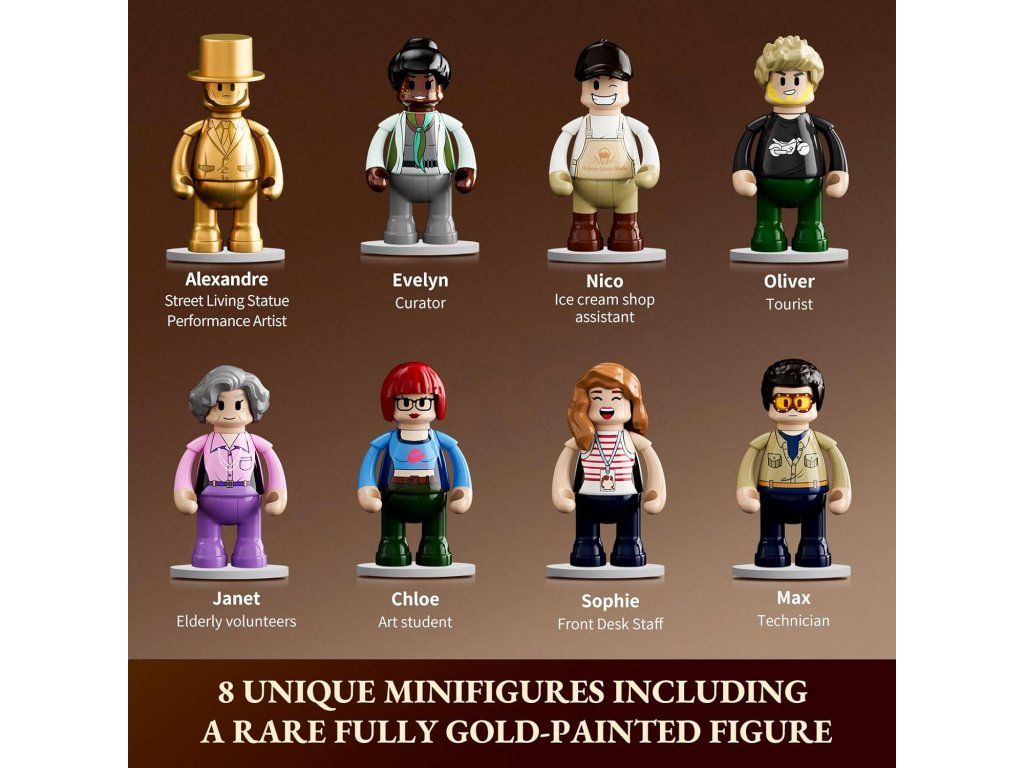 8 egyedi tervezésű minifigura, köztük a galéria kurátorát, fiatal művészeti iskolást, idős önkéntest, turistát, pénztárost, technikust és egy különleges arany színű utcai élőszobor művészt.