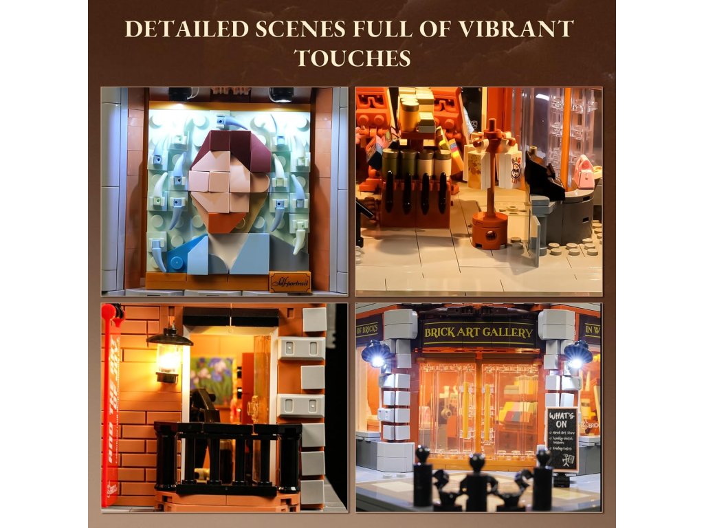 Részletgazdag belső kialakítás – nagy műalkotások építőkocka formában. Éld át olyan világhírű alkotások újraértelmezését, mint a Napraforgók, A sikoly vagy A lány gyöngy fülbevalóval saját művészeti-galériádban. Az épület földszintjén ajándékbolt is található. A homlokzaton a festőművészet egyik legismertebb önarcképét találod levehető 3D alkotásként.